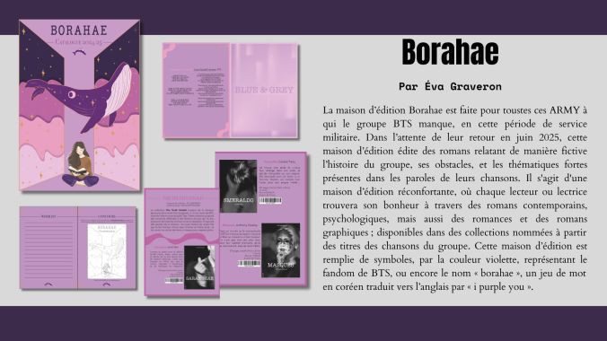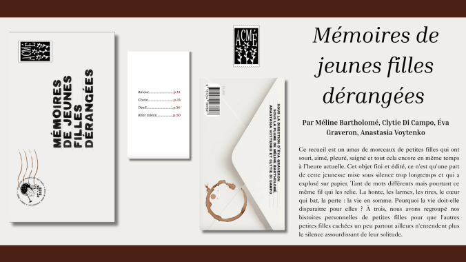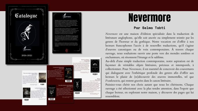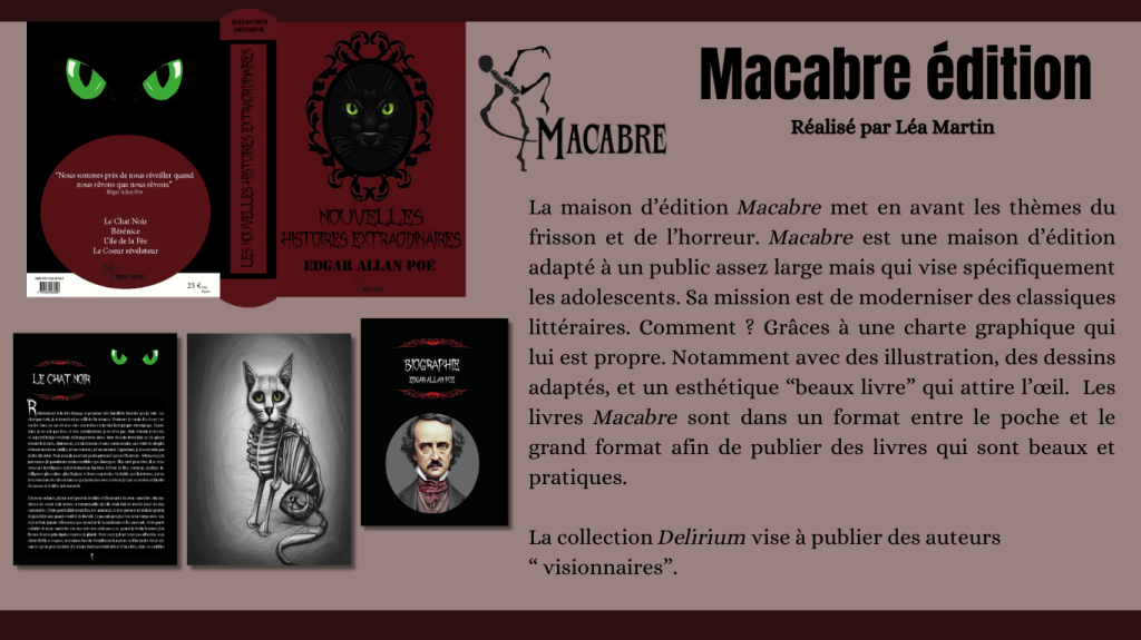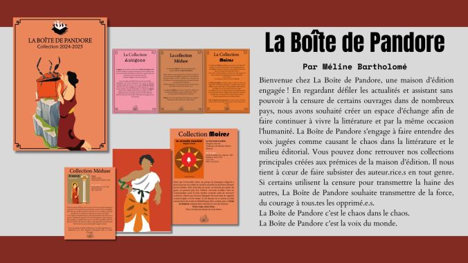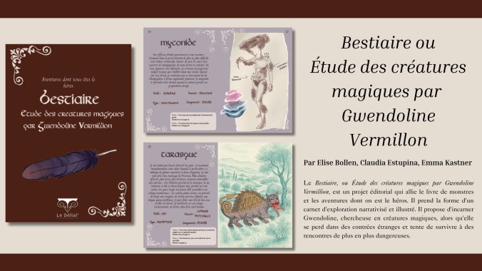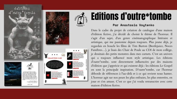 Durant le cours « littérature et édition » de Mme Thérenty, les élèves doivent réaliser un catalogue de maison d’édition fictif dans lequel il faut imaginer de A à Z tous les éléments de sa conception. Voici quelques exemples.