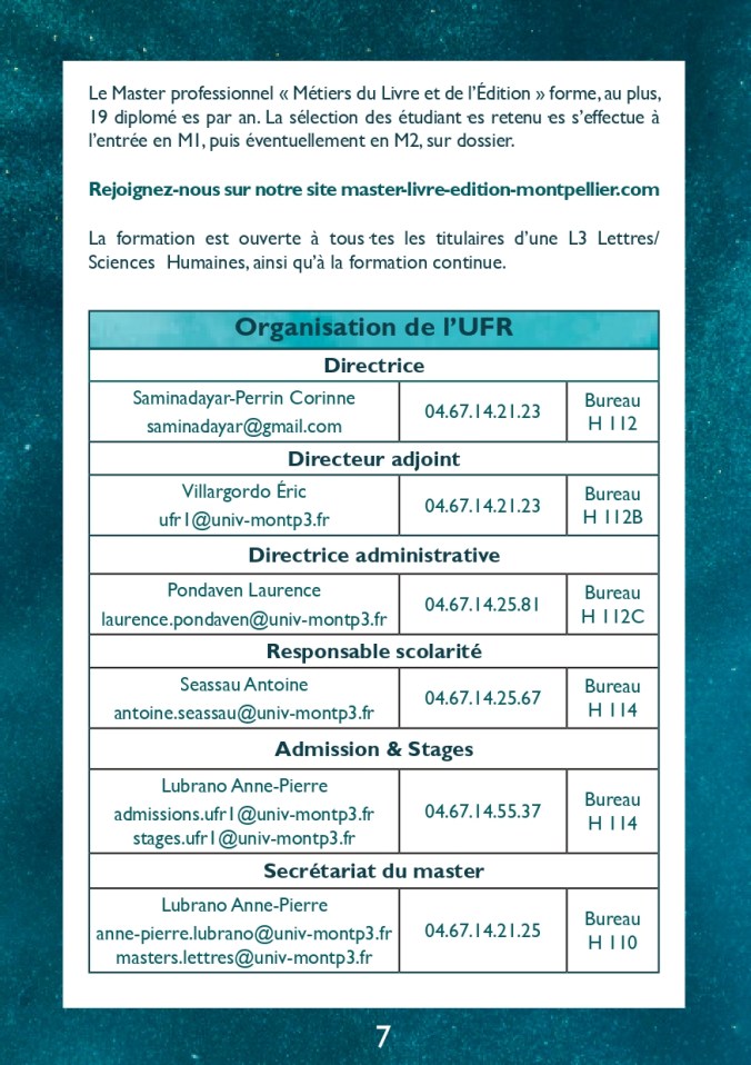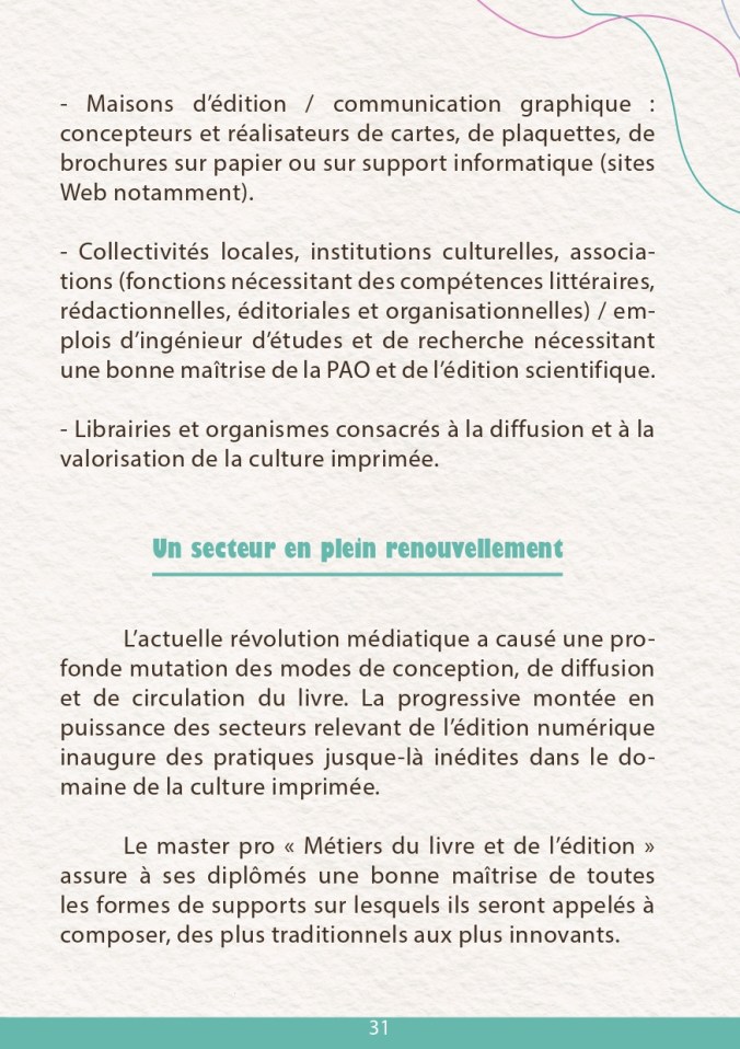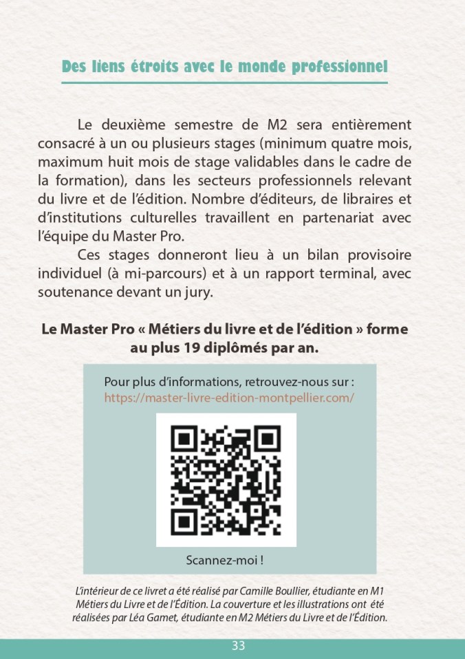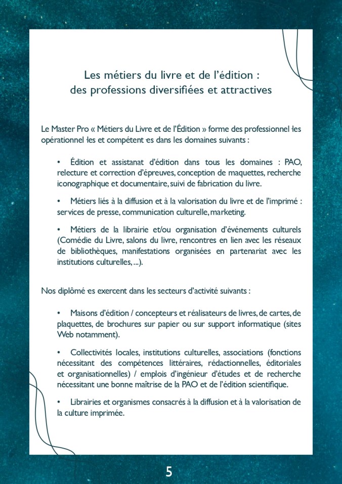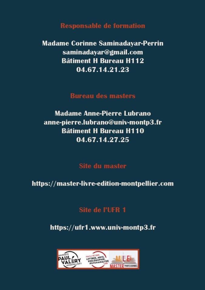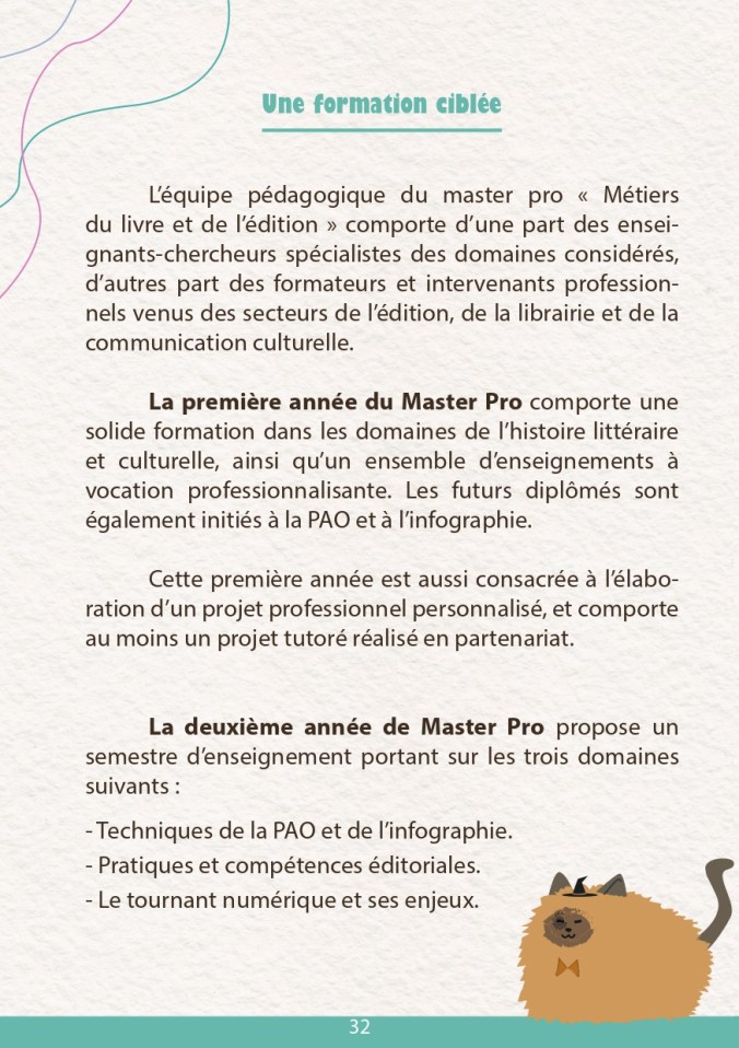 Le Master professionnel Métiers du Livre et de l’Édition forme des professionnel.le.s dans les domaines de l’édition, de la médiation culturelle, de la librairie et des médiathèques. La première année, nos étudiant.e.s s’initient aux compétences infographiques ainsi qu’aux règles orthotypographiques indispensables à leurs travaux, apprennent à gérer et à réaliser des projets culturels et consolident leurs connaissances dans le domaine de l’histoire littéraire. Cette première année permet également la réalisation de projets tutorés et de stages, laquelle représente une première expérience de terrain aussi enrichissante que professionnalisante.