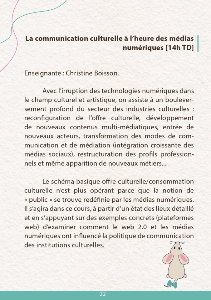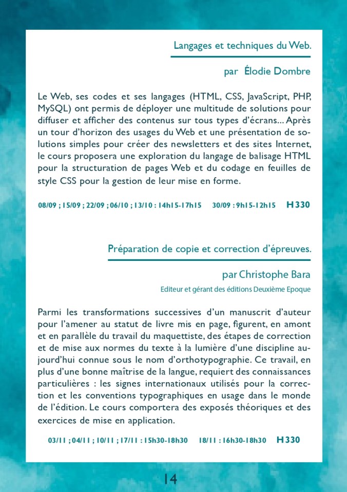 Dans la continuité de la première, la deuxième année assure aux futures diplômé.e.s une bonne maîtrise du graphisme, de l’infographie, du monde éditorial dans toutes ses dimensions, ainsi que de la communication culturelle à l’ère du numérique. La formation se termine par quatre à huit mois de stage.