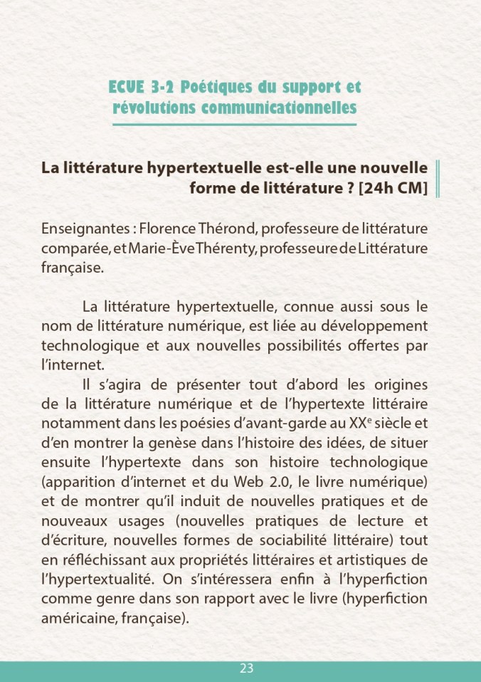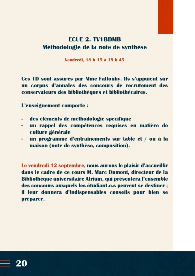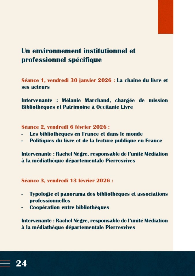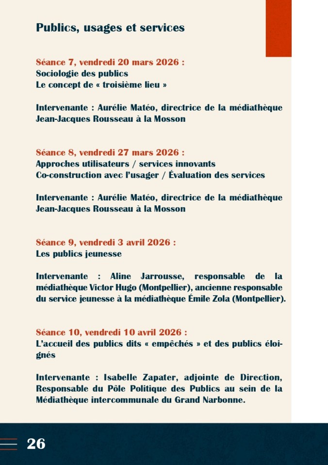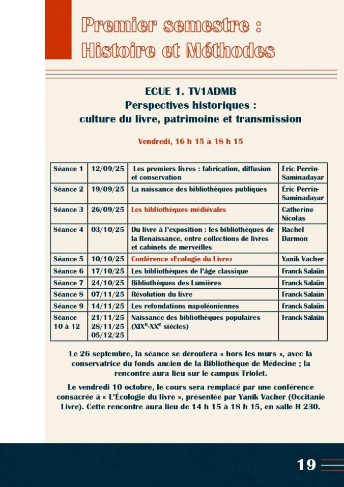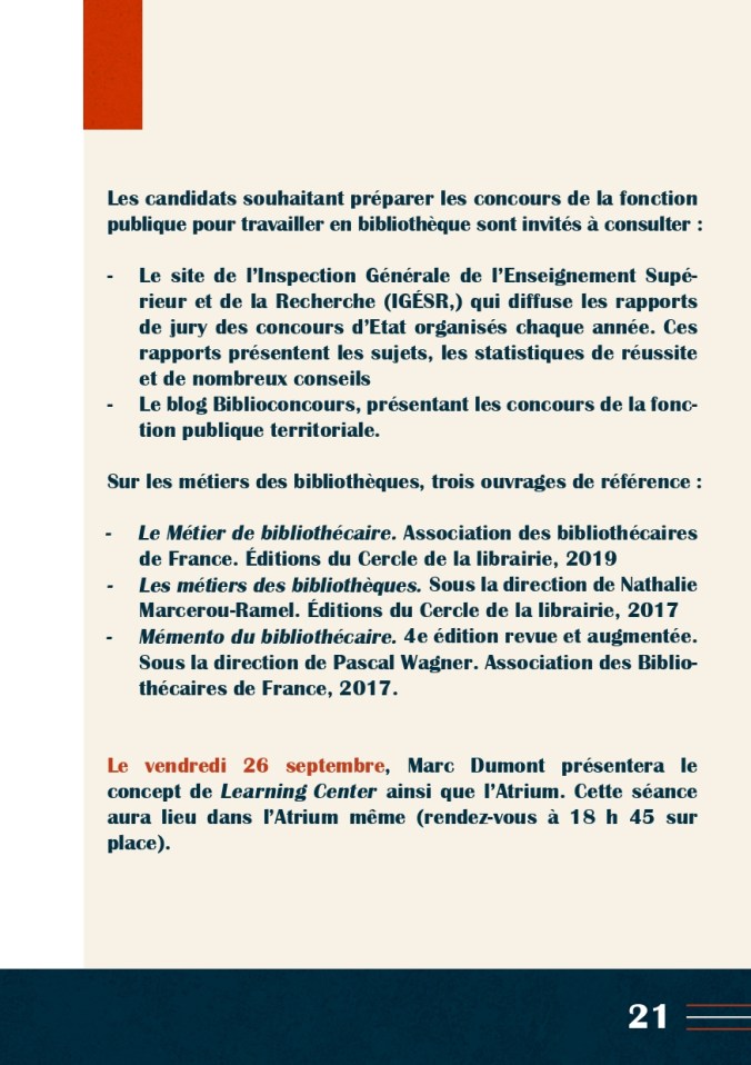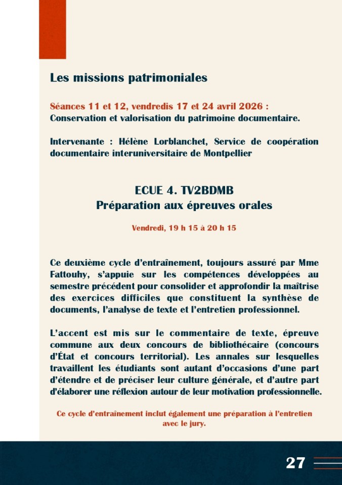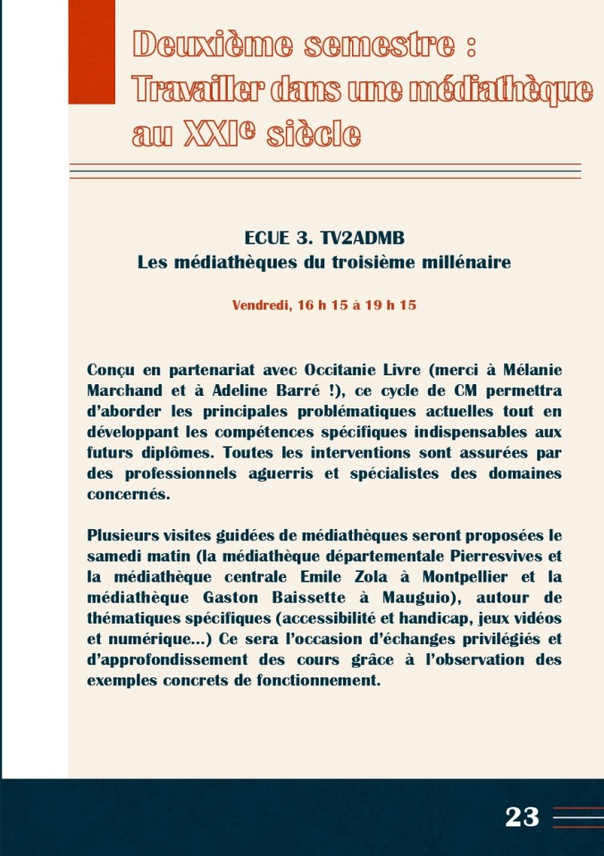 Les missions professionnelles confiées à nos diplômé.e.s supposent souvent une très bonne connaissance du monde des médiathèques et de la lecture publique ; les carrières de bibliothécaire suscitent aussi de nombreuses vocations. Il est vivement conseillé aux étudiant.e.s du M1 MLE de le valider en même temps que leur première année de Master.